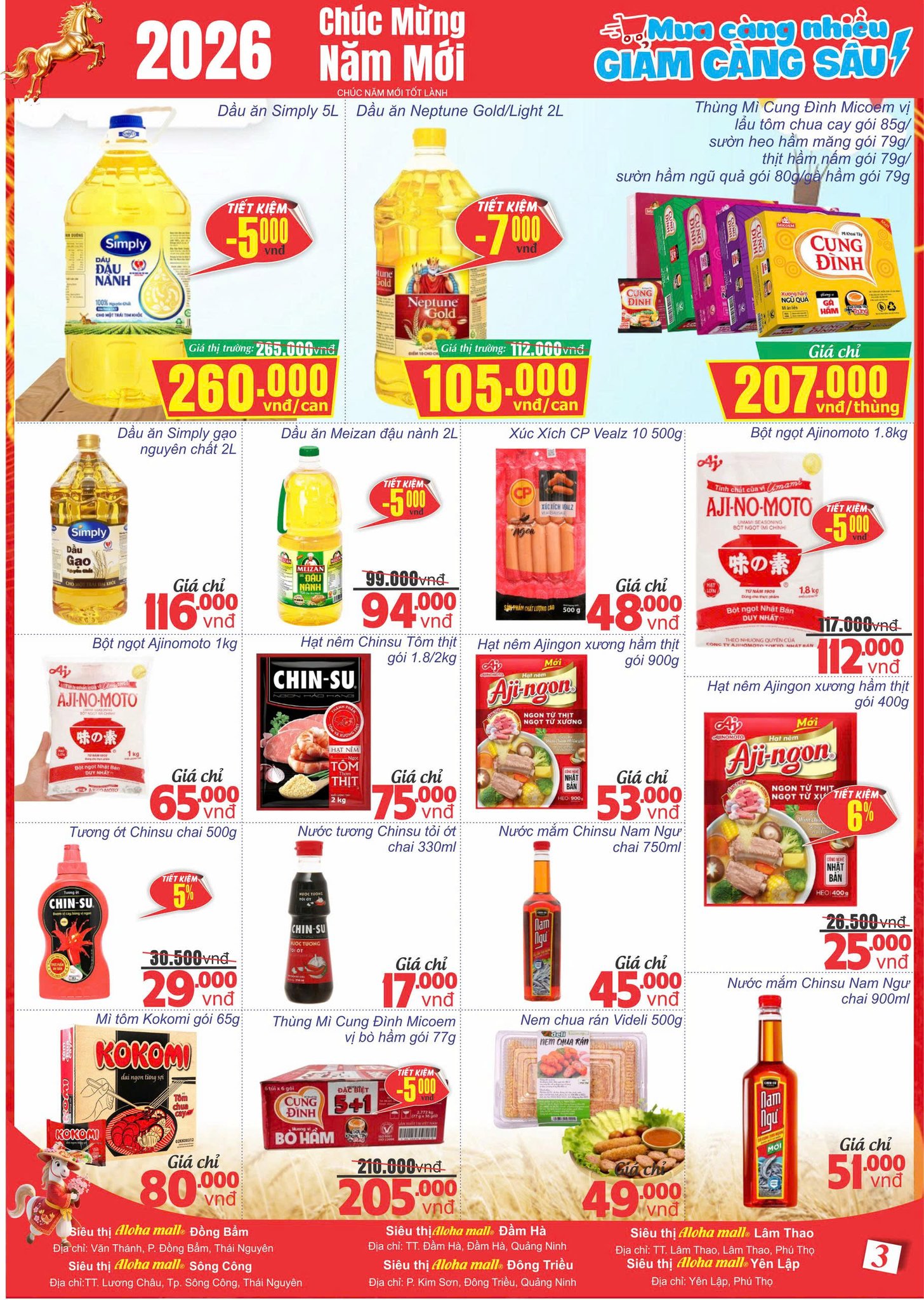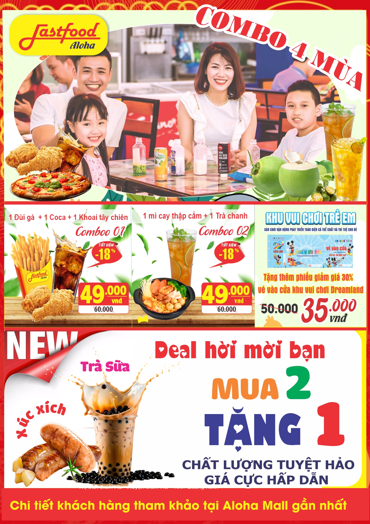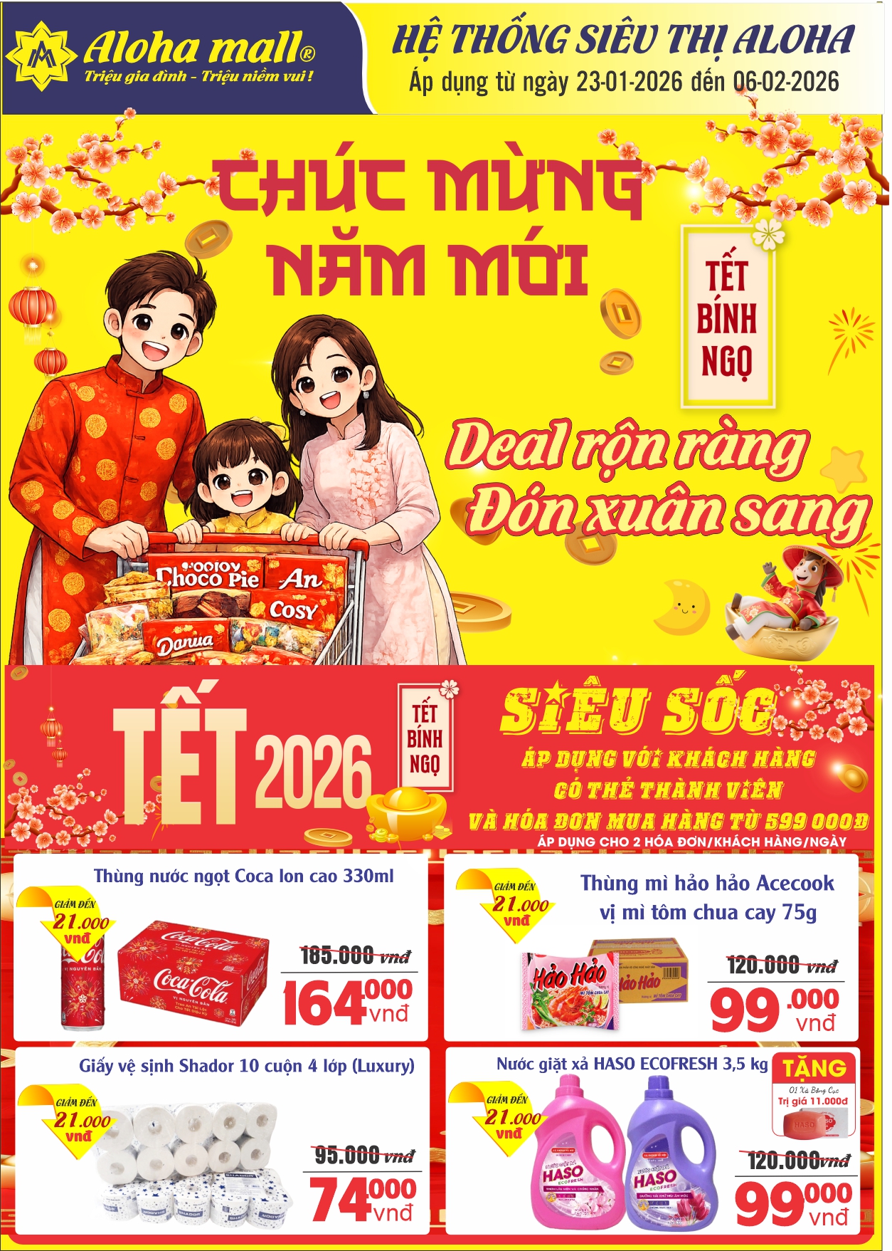 Tết Nguyên Đán 2026 đang đến rất gần, và việc chuẩn bị sớm sẽ giúp mỗi gia đình có một mùa Xuân trọn vẹn, đủ đầy và thoải mái hơn. Với chương trình "Deal sang rộn ràng - Đón Xuân sang", Aloha Mall mong muốn đồng hành cùng khách hàng trong hành trình mua sắm Tết tiết kiệm, tiện lợi và an tâm. Hàng đã lên kín kệ, giá tốt đã sẵn sàng. Hãy đến Aloha mall Aloha mall để tận hưởng không khí sắm Tết rộn ràng và chuẩn bị cho một mùa Xuân ấm áp, sung túc bên gia đình. Aloha mall - Điểm đến mua sắm thiết yêu cho mọi nhà dịp Tết.