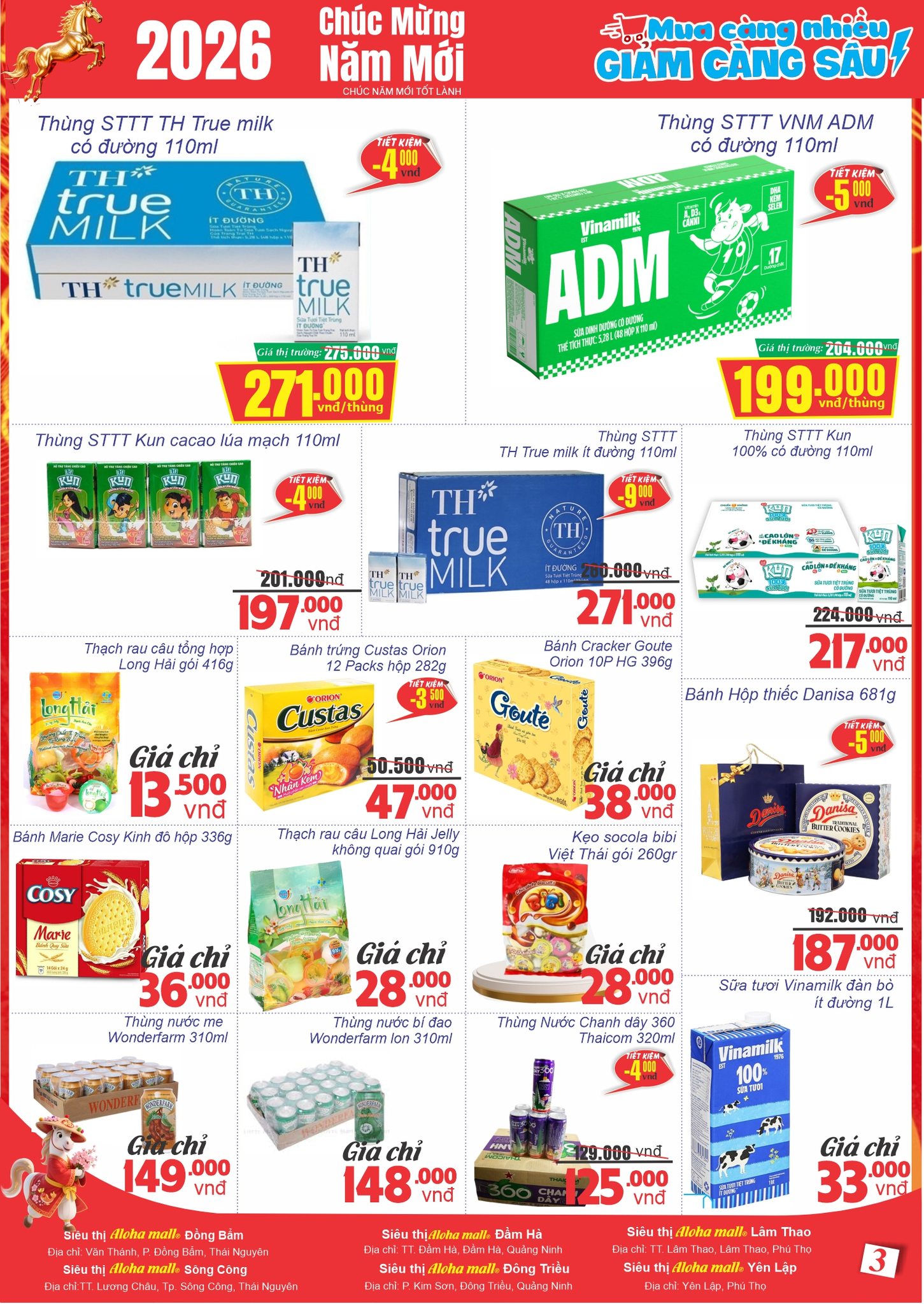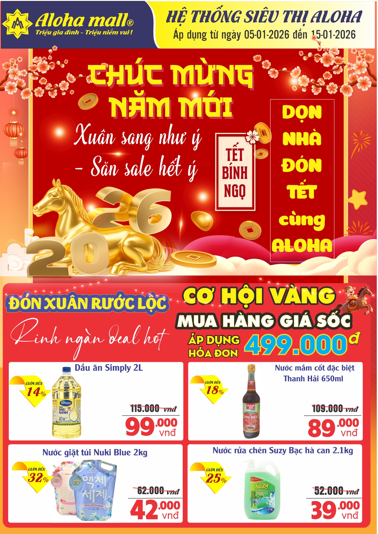 Các Chương trình khuyến mại bắt đầu từ ngày 05/01 đến hết ngày 15/01/2026 và được áp dụng trên toàn Hệ thống siêu thị Aloha.