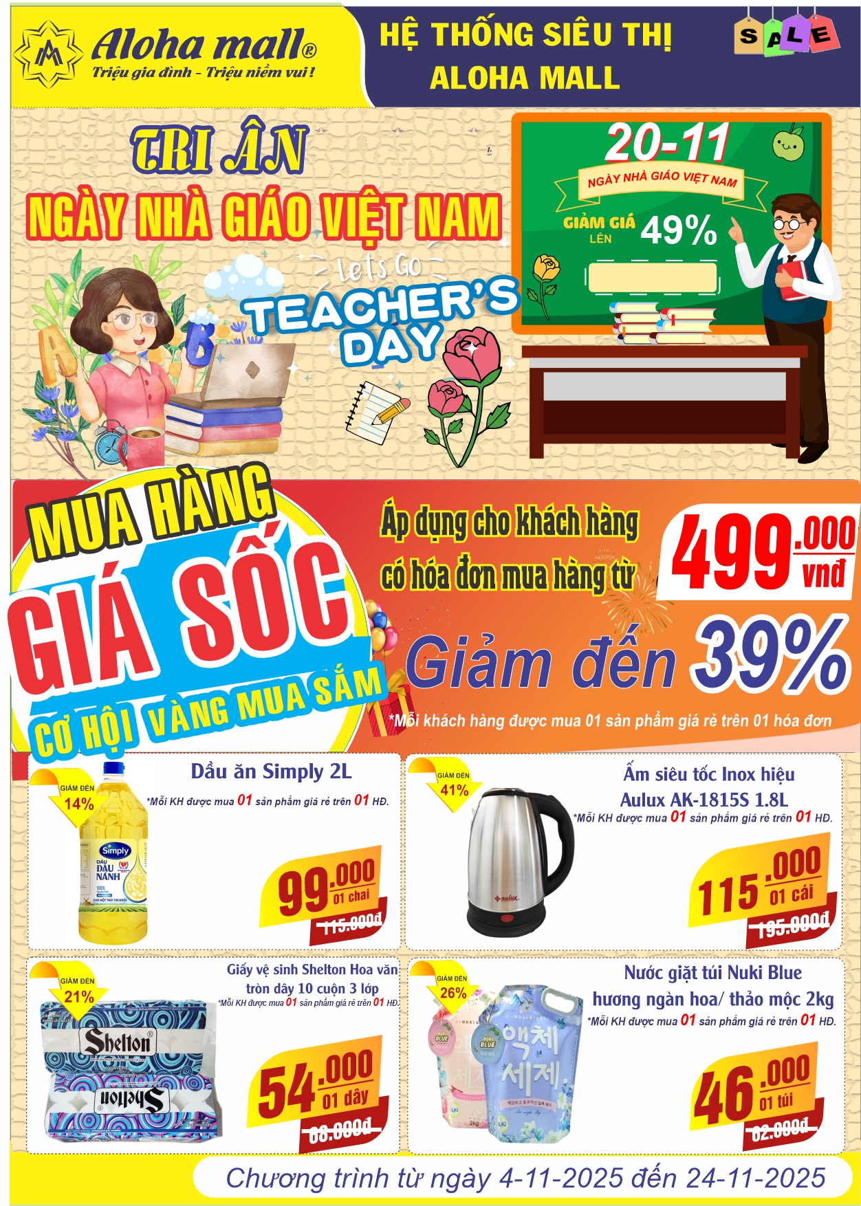 Bạn mua quà tri ân thầy cô hay nhu yếu phẩm cho gia đình, Hệ thống siêu thị Aloha đều có sẵn cho bạn với chất lượng đảm bảo - giá siêu hời. Ghé ngay Aloha mall gần bạn nhất để săn ưu đãi tốt, mua sắm hàng hóa thỏa thích nha!